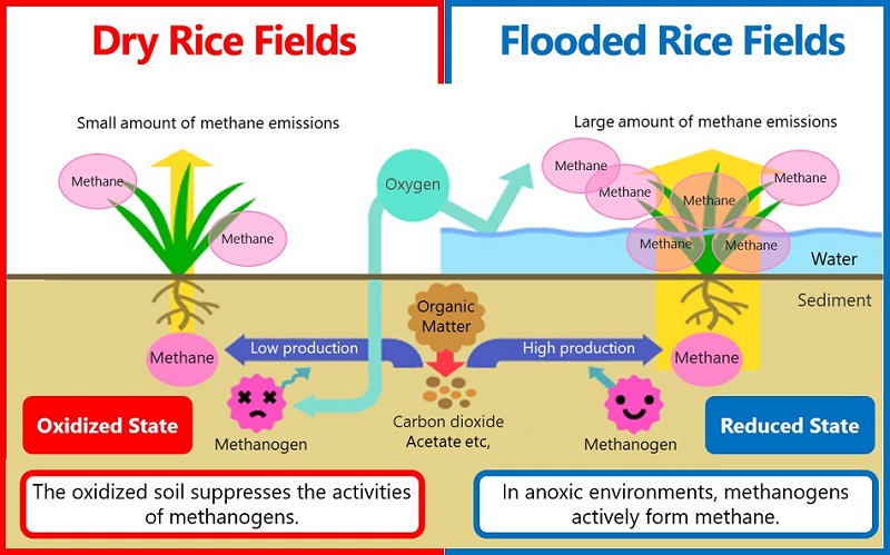 Although there are regional differences in the timing of methane generation from paddy fields, the activity of methanogens increases when there is water in paddy fields from mid to late June when new stems emerge from the original stem.