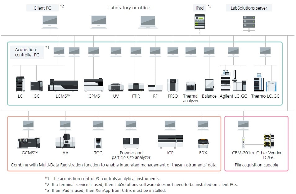 The measurement results of HPLC, GC, GCMS, LCMS, UV, FTIR, balance, TOC, thermal analysis, particle size distribution (SALD), and other analyzers in the laboratory can be managed in the LabSolutions server.