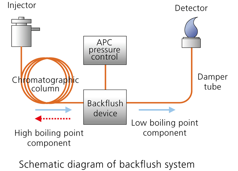 The backflush system reverses the carrier gas flow after the target compounds have eluted, to discharge...